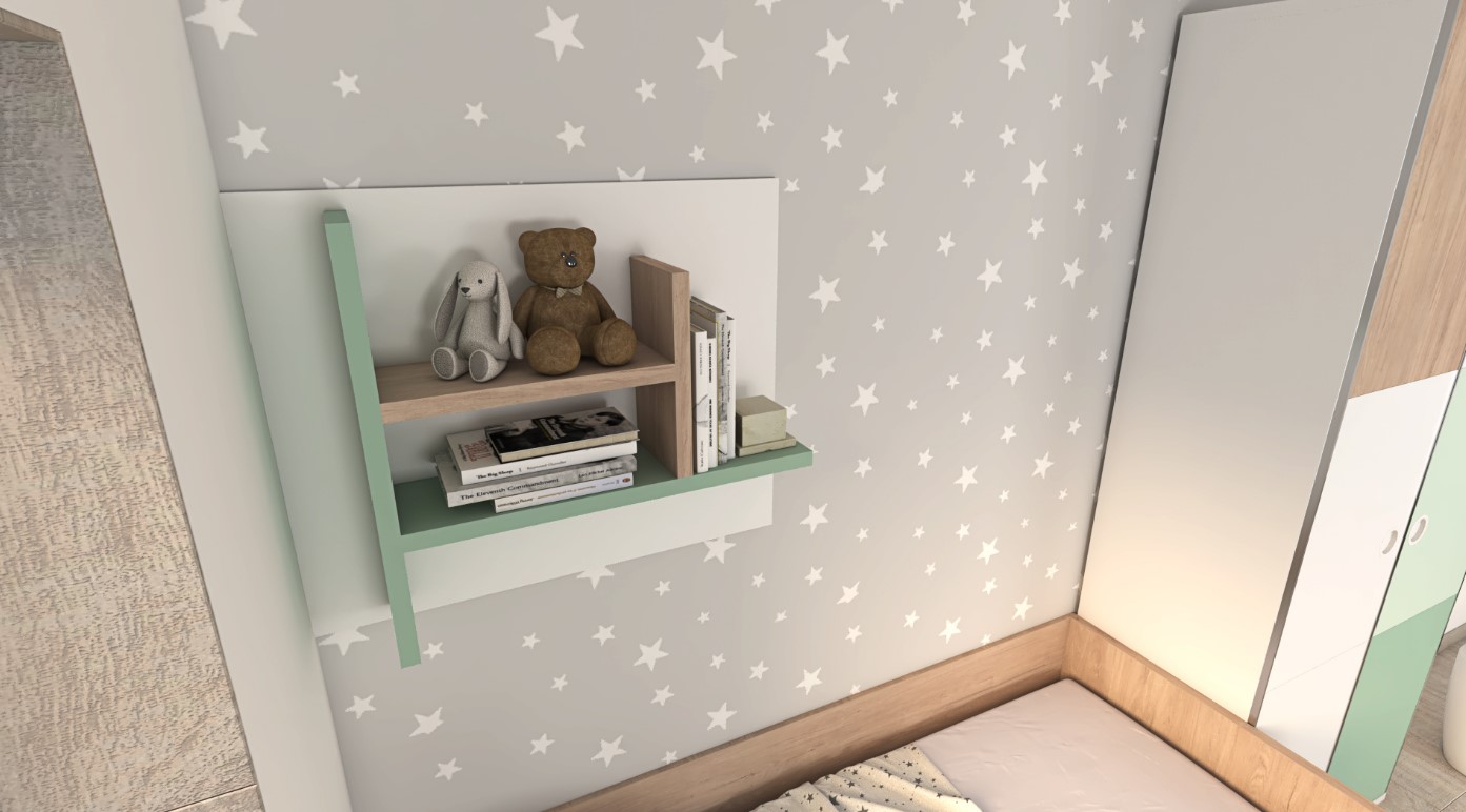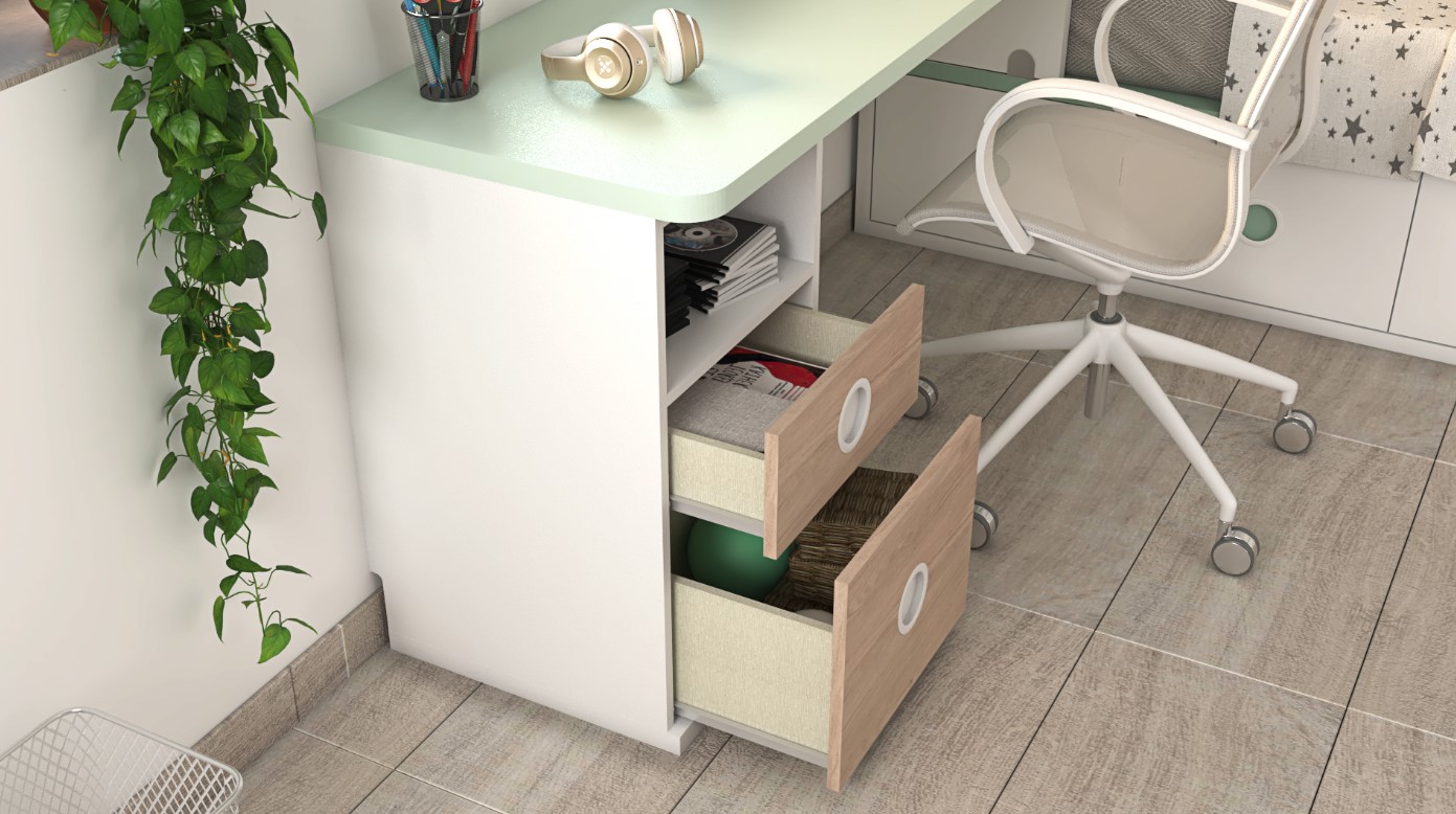Desk with Integrated Storage: Complementing the day bed, the desk emerges as a beacon of creativity and efficiency. It includes a storage cabinet that provides ample space for study materials or creative tools, ensuring a clutter-free workspace that inspires productivity and imagination. The desk’s design reflects the collection’s commitment to blending utility with beauty.