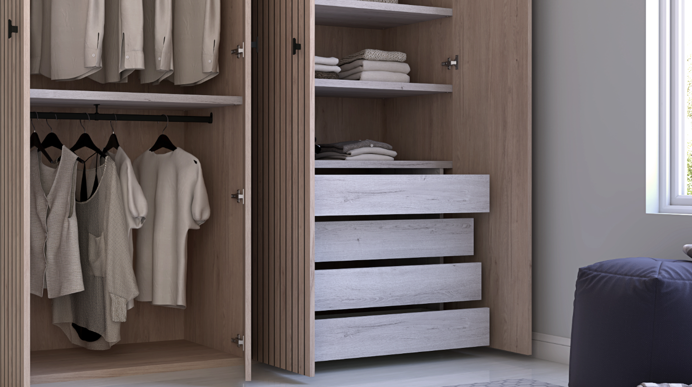 Finished in warm Roble Aurora, complemented by Roble Aurora Ranurado fronts and subtle Roble Almo drawer accents, the Mirador Collection creates a calm, harmonious aesthetic rooted in natural materials. The built-in four-door wardrobe features a thoughtfully organized interior with shelving, hanging rods, and an integrated four-drawer chest, providing generous space for clothing and accessories.