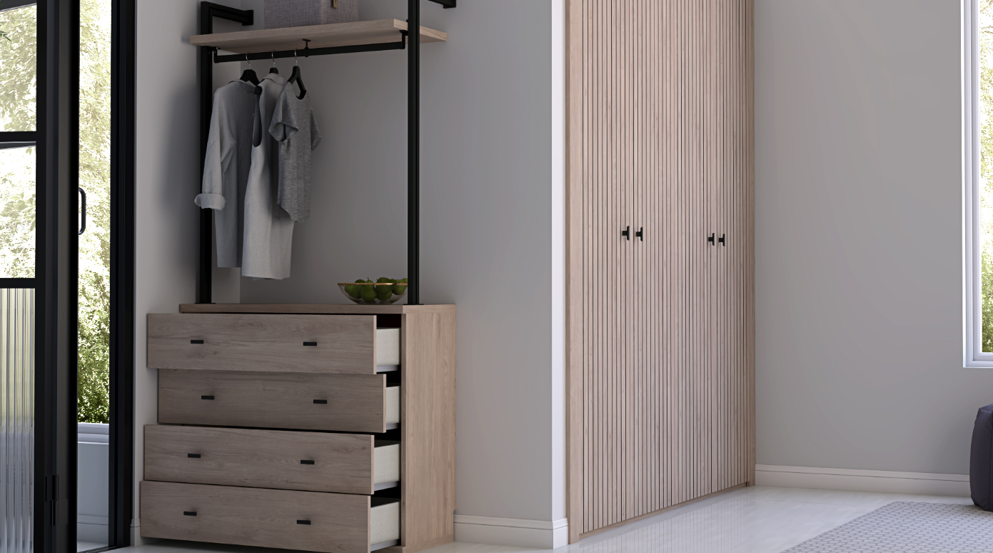 Enhancing the composition is a standalone four-drawer chest, designed to match the wardrobe and equipped with a railing and hanging rod, plus an overhead shelf for additional organization. This flexible unit adds functionality while maintaining visual continuity throughout the space.