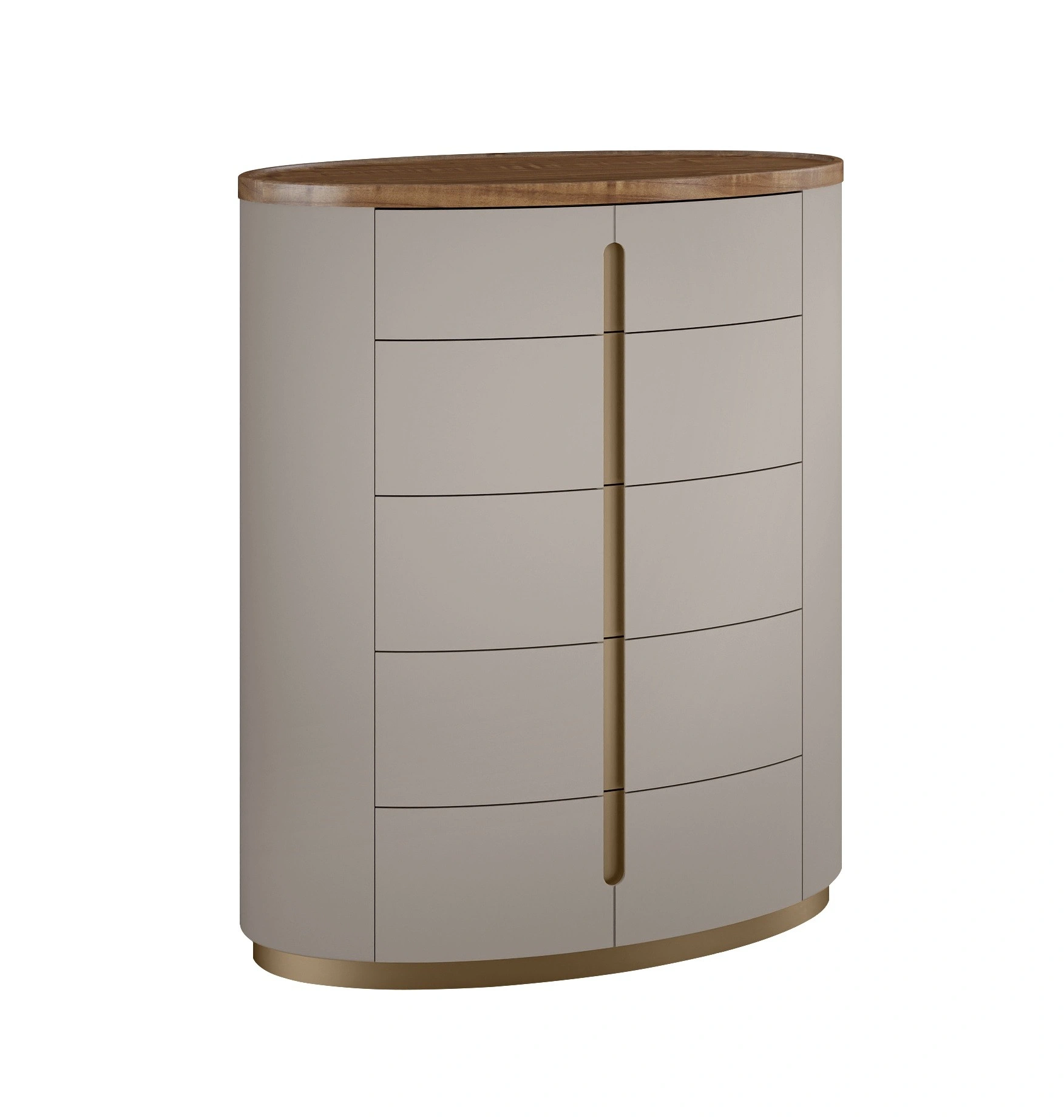 Premium Finishes: A striking dark walnut countertop provides a rich contrast against the light flannel grey finish. This dual-tone palette is grounded by a brushed bronze accent base, adding a touch of metallic luxury and visual layering.