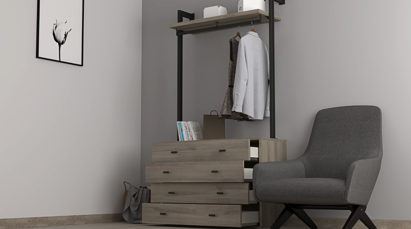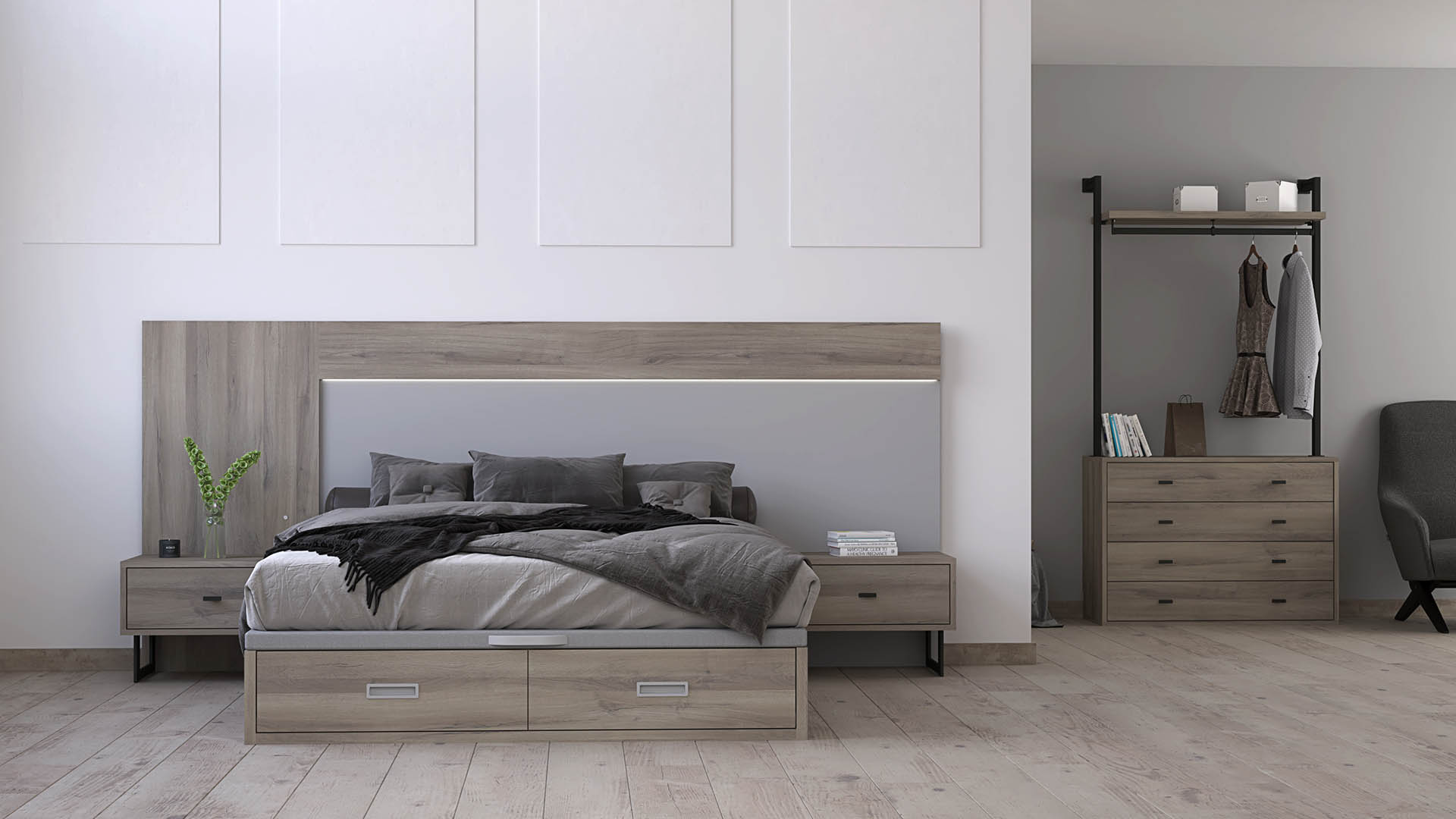 The extended queen bed features an LED-lit headboard with built-in storage and a lift platform, offering both style and practical space for everyday and seasonal items. The one-drawer nightstands on metal legs add a sleek, minimalist touch, while the four-drawer chest with hanging rod and shelf provides versatile organization for clothing and accessories.
