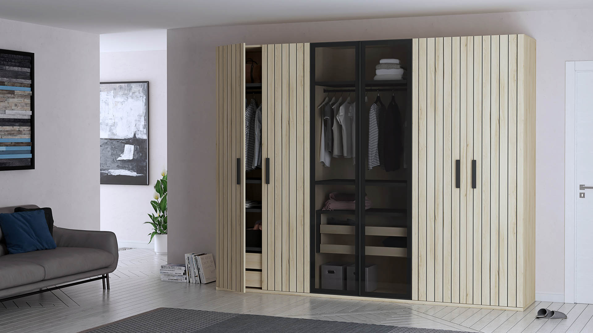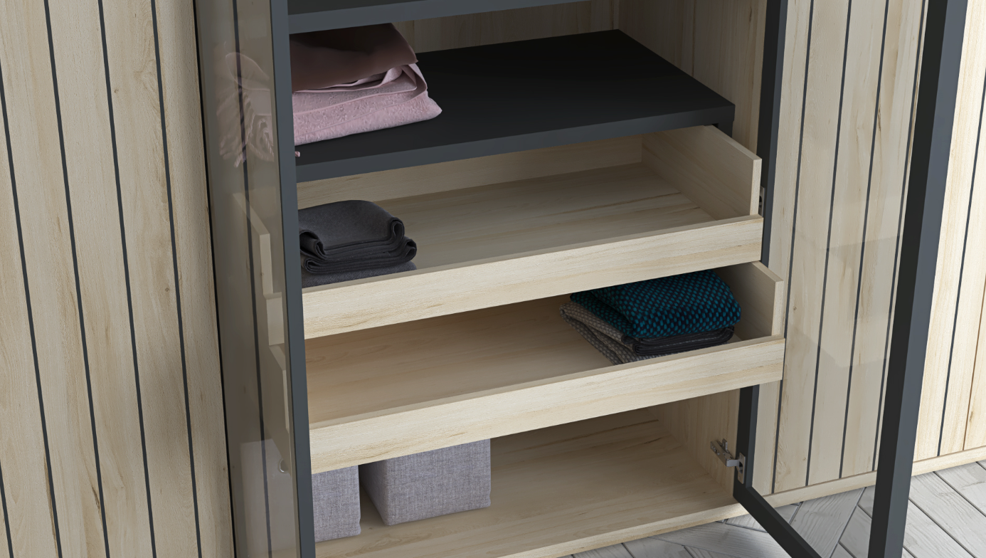 Finished in warm Haya Gala and textured Haya Gala Ranurado, complemented by modern Pizarra accents, the Ribadesella wardrobe creates a rich and inviting visual composition. Two central tinted glass doors framed in black aluminium profiles add depth and a modern architectural highlight while allowing subtle visibility into the interior.