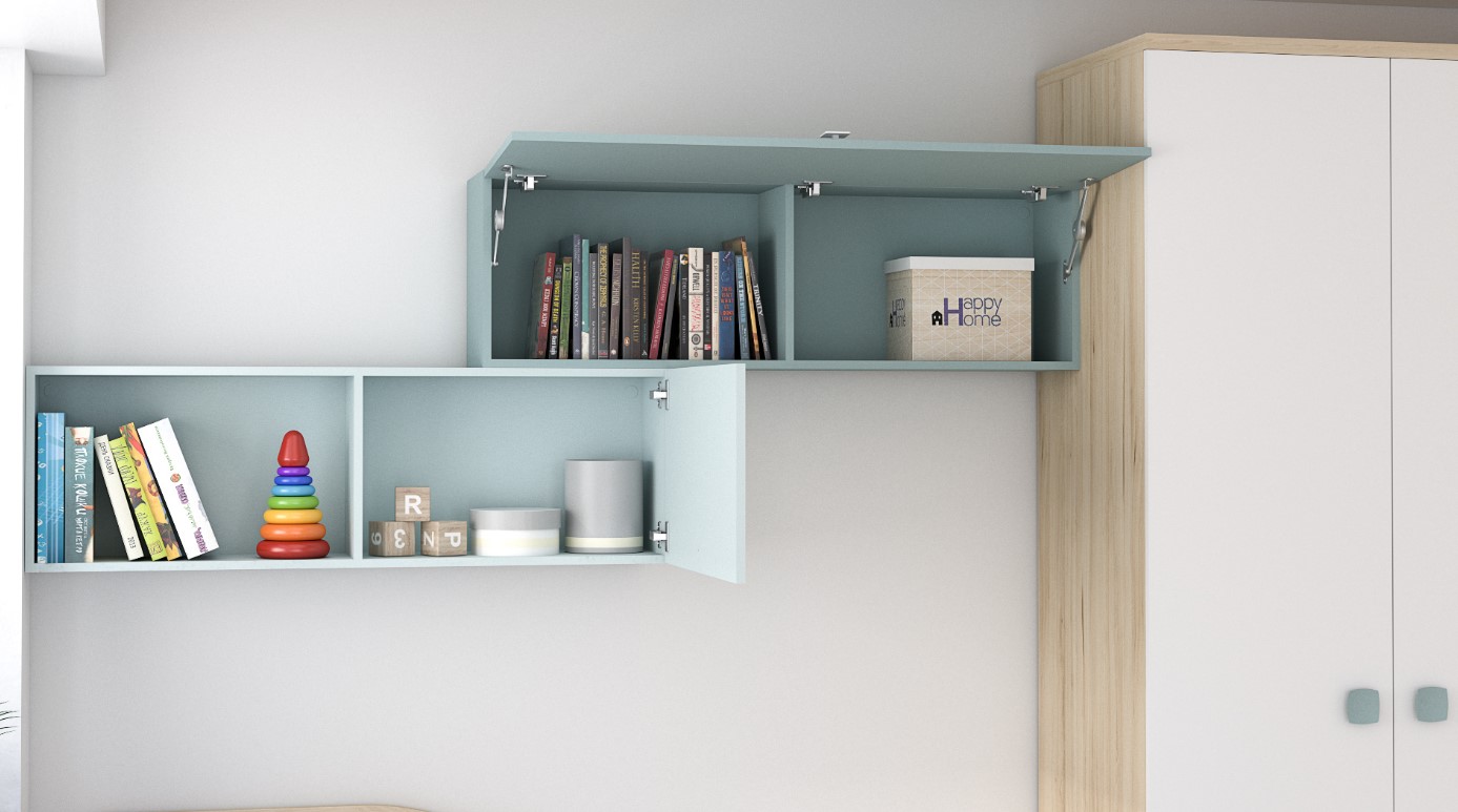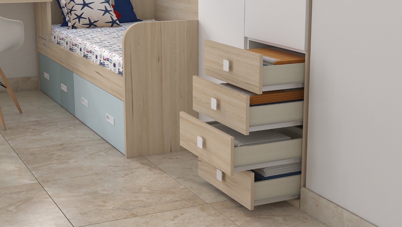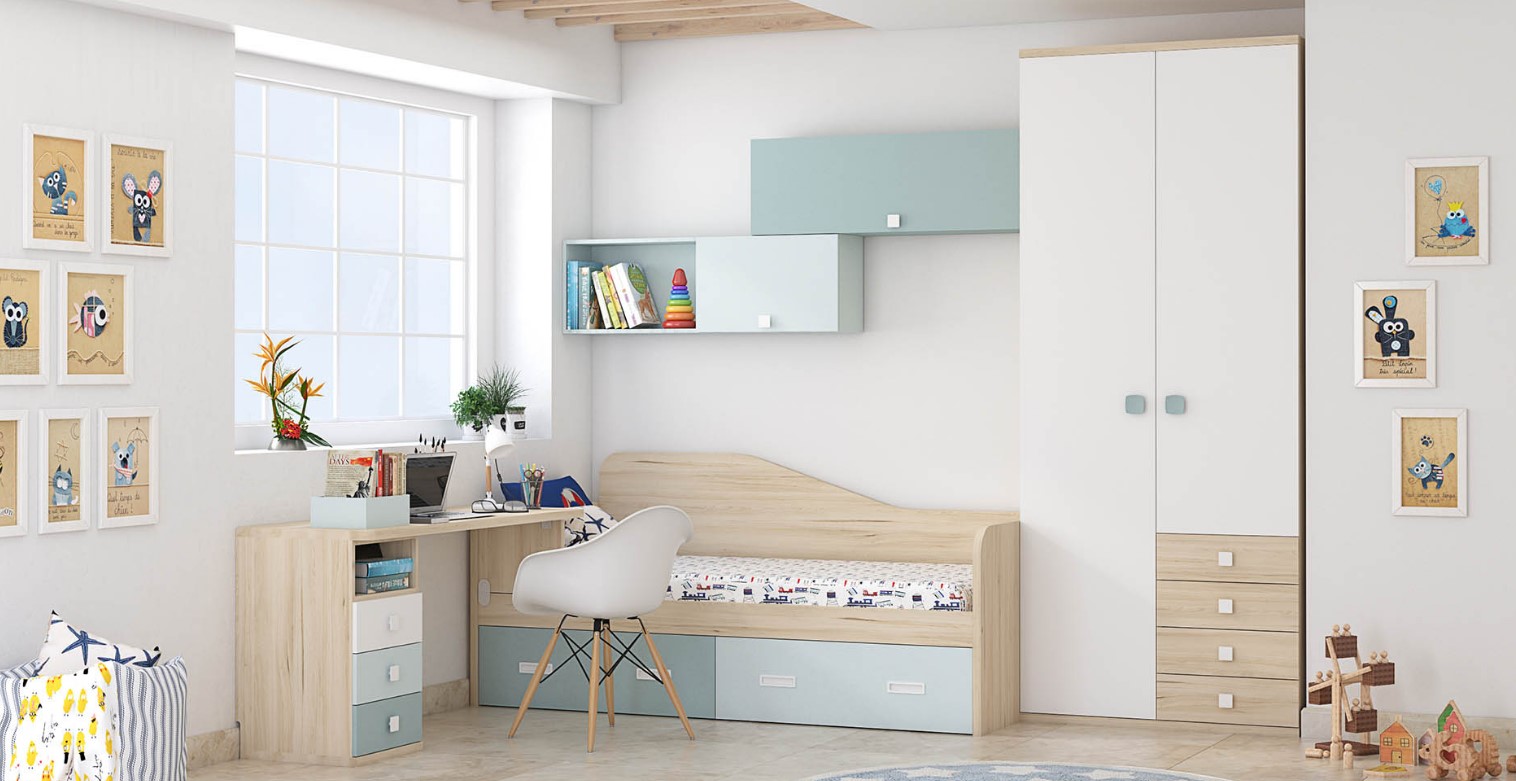 Spacious Two-Door Wardrobe with Chest: The two-door wardrobe, complete with a four-drawer chest, encapsulates the essence of the Tarragona Tesoros collection. This piece combines ample storage with aesthetic appeal, featuring fronts in Aqua, Azul Nube, and Blanco against the Haya Gala body, offering a practical yet picturesque solution for clothing and accessories.