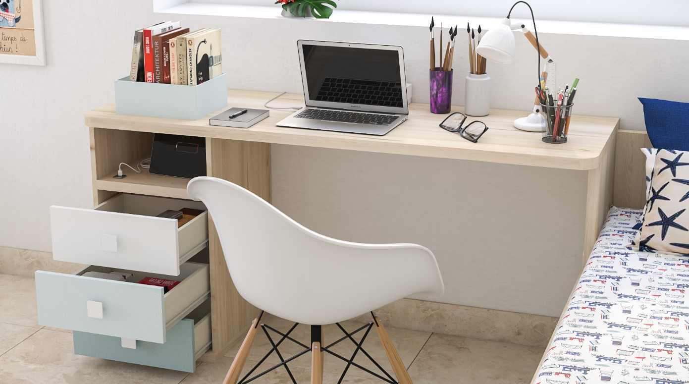 Desk with Integrated Storage: Accompanying the day bed, the desk stands as a testament to thoughtful design and efficiency. Equipped with storage drawers, it ensures a clutter-free workspace that inspires productivity and creativity, all while echoing the collection’s aesthetic with its harmonious color scheme.