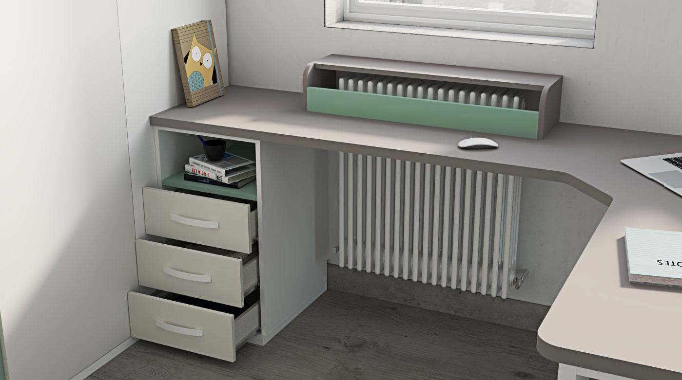 Innovative Corner Desk with Recessed Countertops: The corner desk, complemented by an under-desk storage cabinet featuring three drawers and a shelf, is crafted to accommodate the contours of your room. Its innovative design includes recessed countertops that seamlessly integrate with your living space, cleverly avoiding obstacles like radiators. The result is a study area that’s not only functional but flawlessly integrated into your room’s aesthetic.