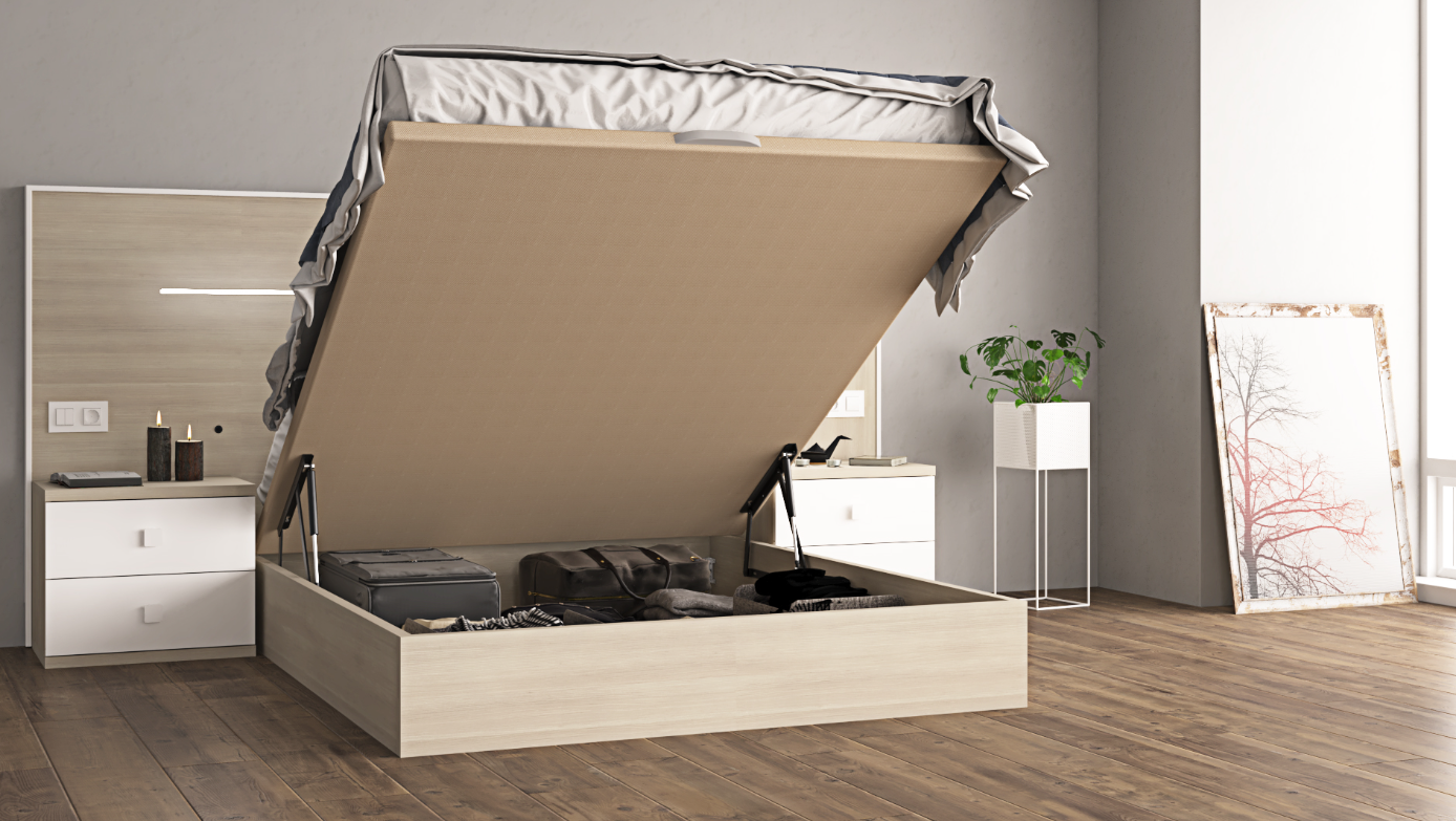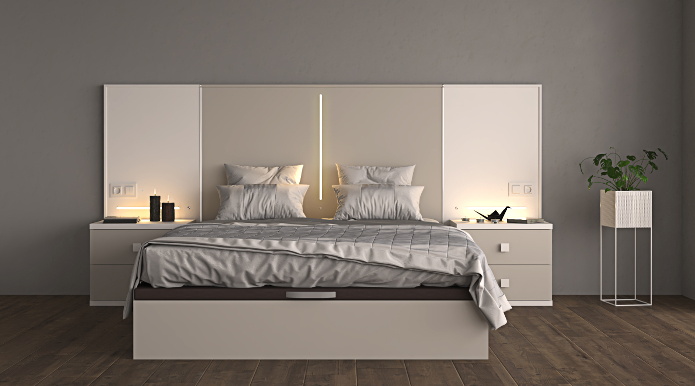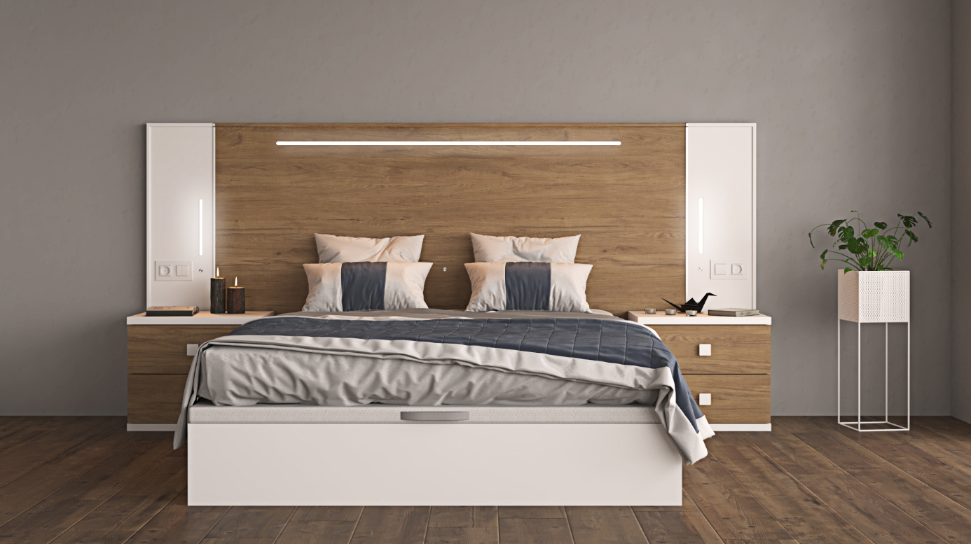 The extended headboard bed features integrated LED lighting for soft ambient illumination and lift-up storage for efficient use of space, making it both elegant and highly practical. The two nightstands with two drawers each provide clean, organized bedside storage while maintaining a contemporary, cohesive look.