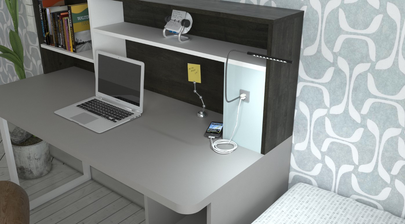 The study desk’s smart connections feature ensures devices stay charged, blending utility with sleek design to support both study and leisure activities.