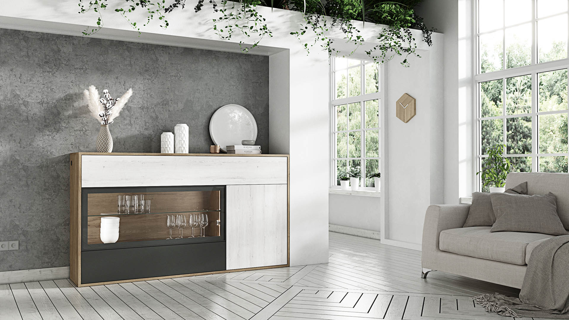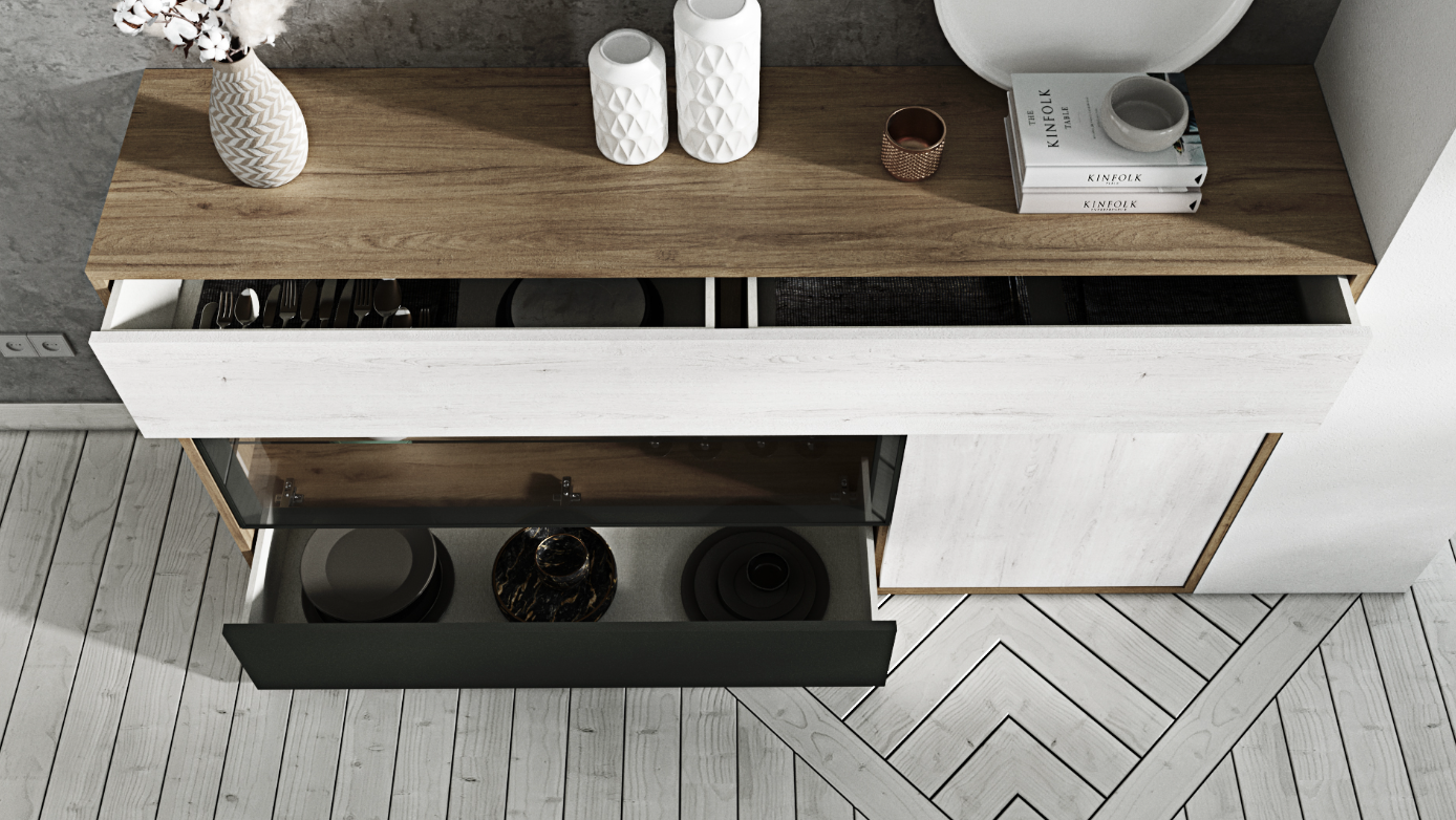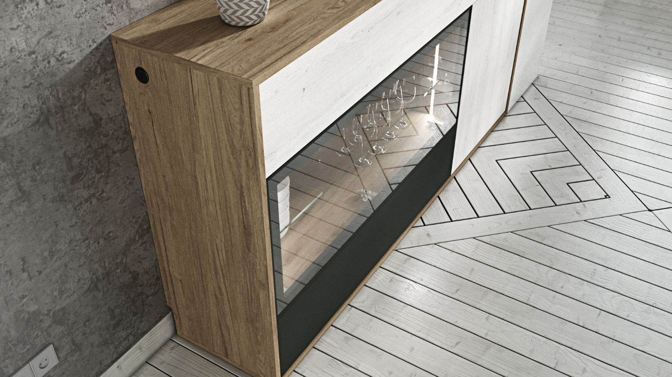The Credenza Zacarías combines the warmth and natural elegance of Roble Denver for its body with the refined contrast of Roble Almo and Pizarra fronts, crafting a piece that is as functional as it is beautiful. Designed to bring sophistication and storage to any living or dining space, this credenza features thoughtful details like LED lighting and versatile storage solutions, making it a standout addition to any home.