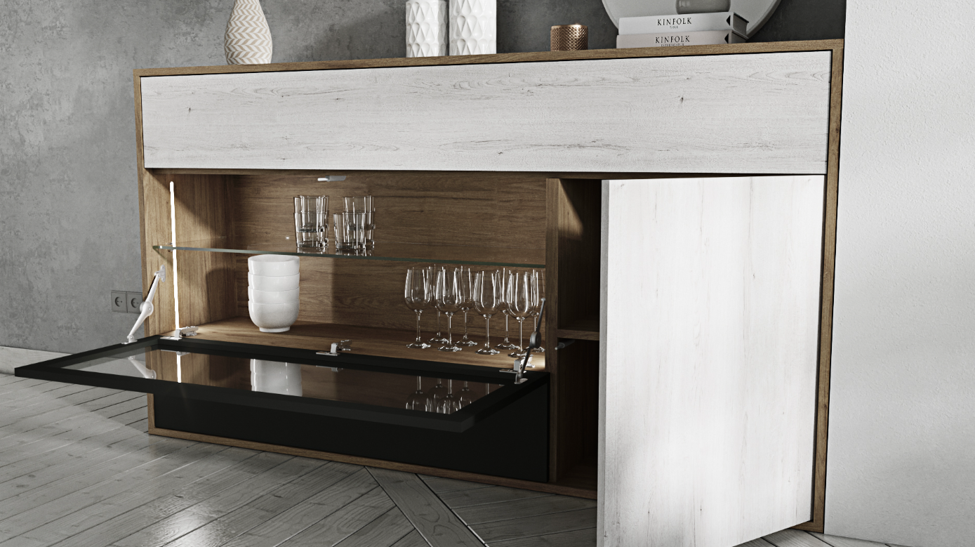 Large Folding Door with LED Light: The credenza includes a large folding door, concealing storage space that is illuminated with an LED light. This feature not only adds functionality but also creates an ambient effect, perfect for displaying glassware, dishes, or decorative items.